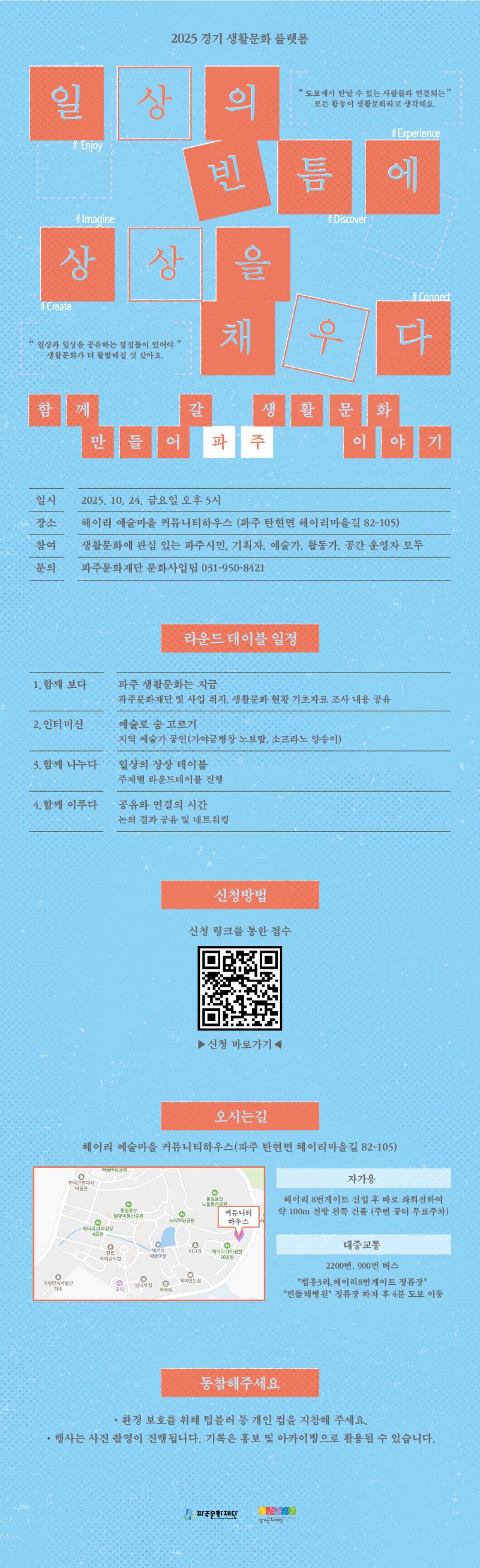 파주시민 누구나 일상에서 주체적 생활문화 활동을 할 수 있는 기반을 조성하고자 합니다.