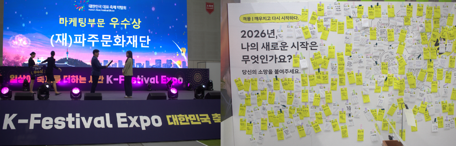 박람회 기간 중 열린 베스트 축제 어워드는 홍보부스 운영계획, 프로그램 참여도, 현장 평가 등을 종합해 선정되며, 콘텐츠 구성과 홍보 전략, 현장 운영 완성도가 주요 기준으로 반영됐다. 파주문화재단은 체험형 콘텐츠와 적극적인 현장 소통으로 관람객 참여를 이끌었고, SNS 팔로워가 약 27% 증가하는 등 마케팅 부문에서 높은 평가를 받았다.