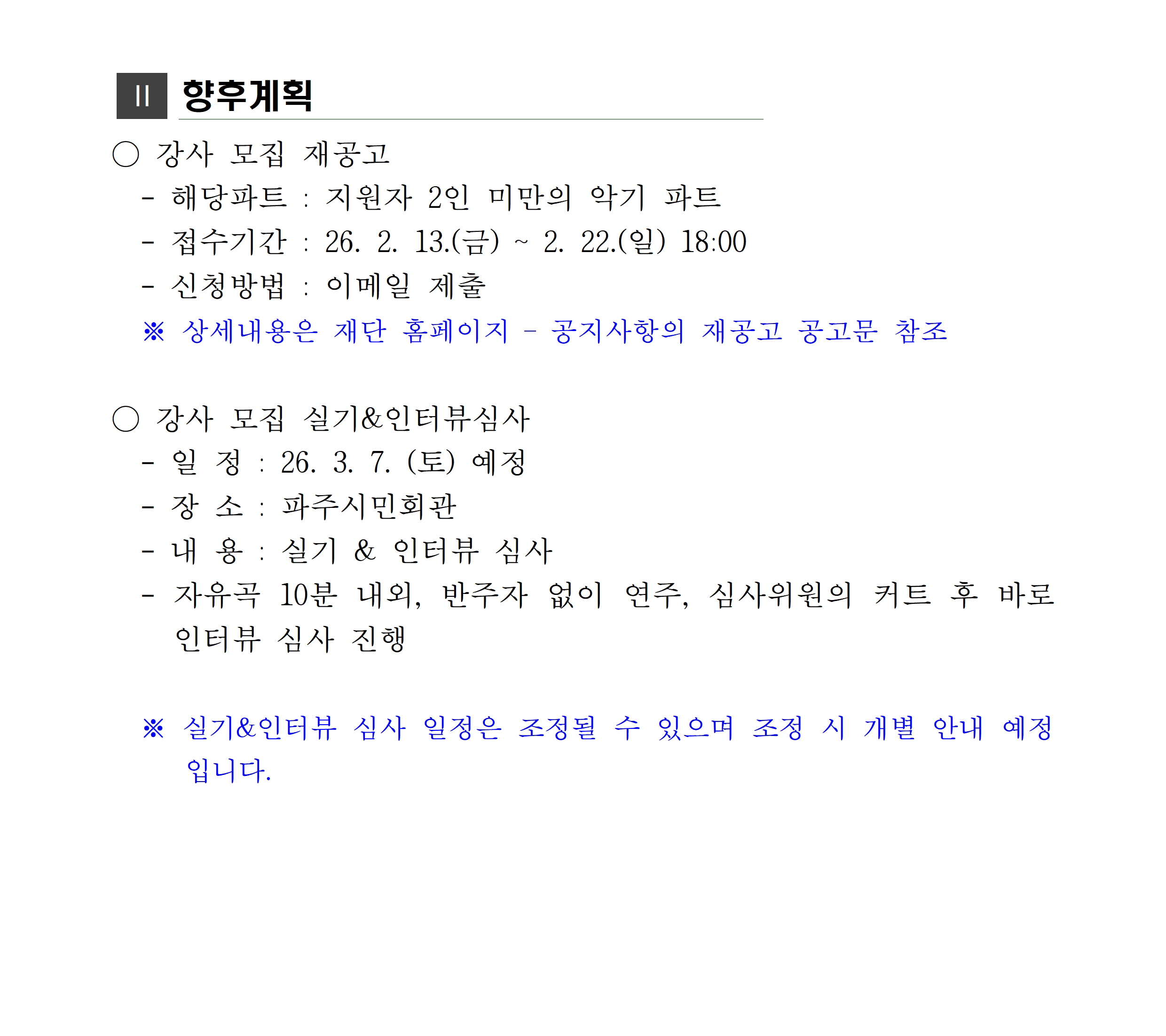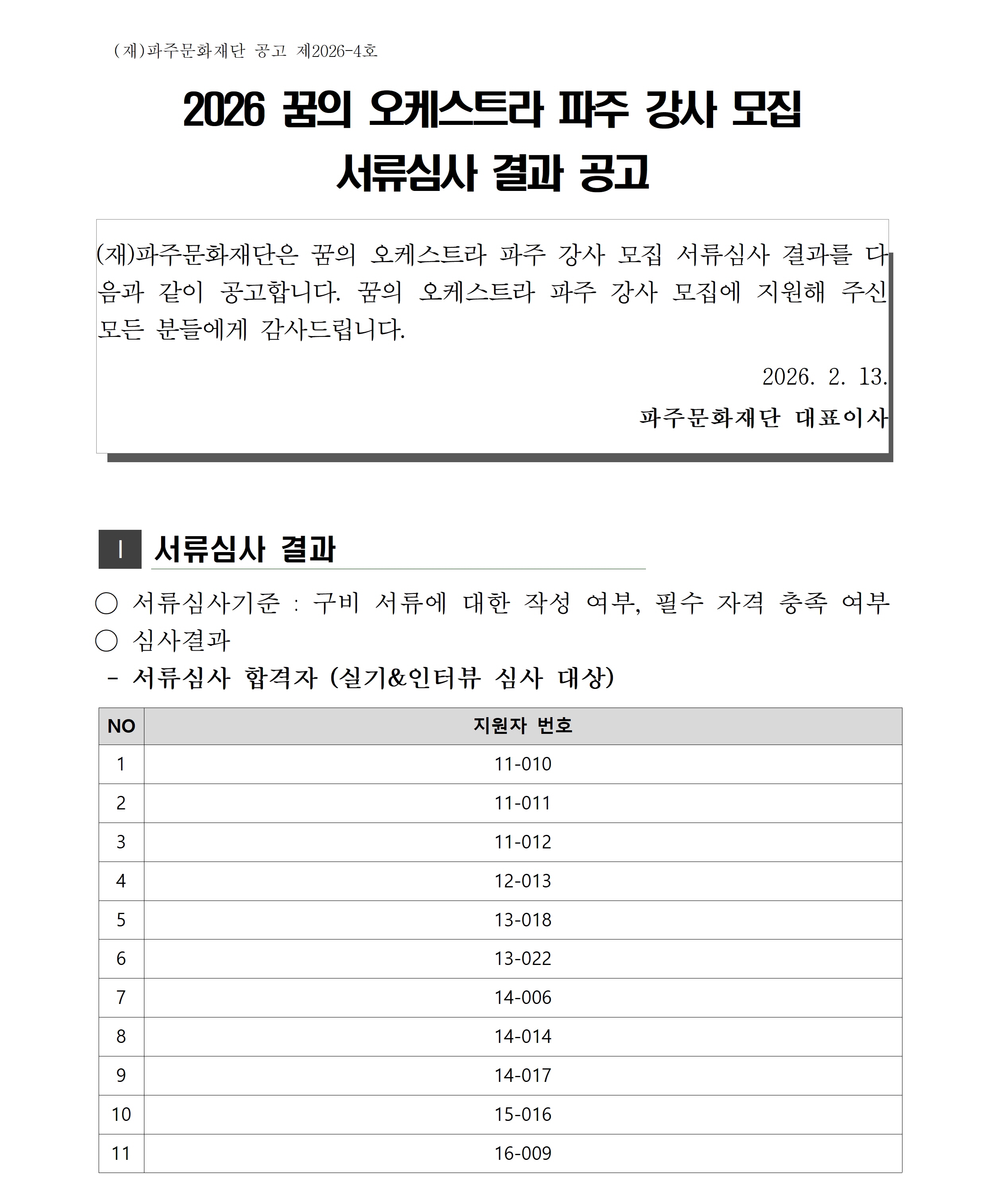 [파주문화재단 공고 제2026-04호] '2026 꿈의 오케스트라 파주' 강사 모집 서류심사 결과 공고