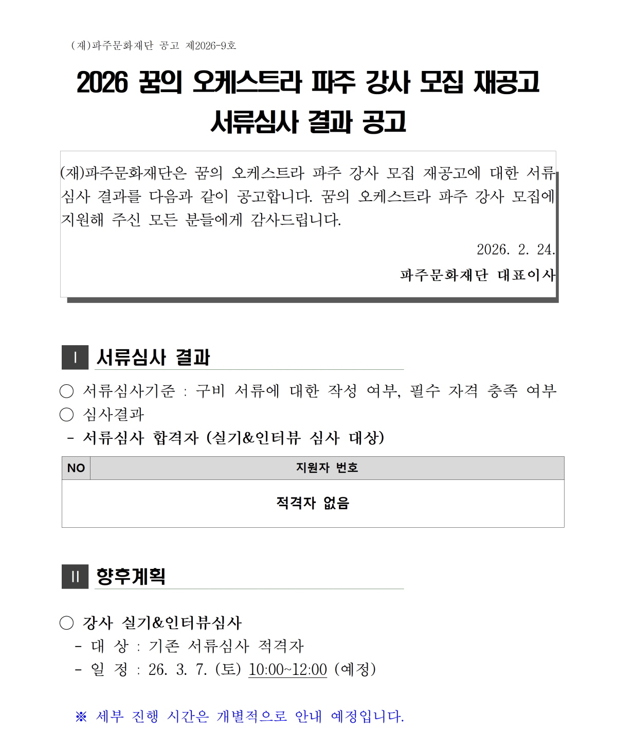 [파주문화재단 공고 제2026-09호] '2026 꿈의 오케스트라 파주' 강사 모집 재공고 서류심사 결과 공고