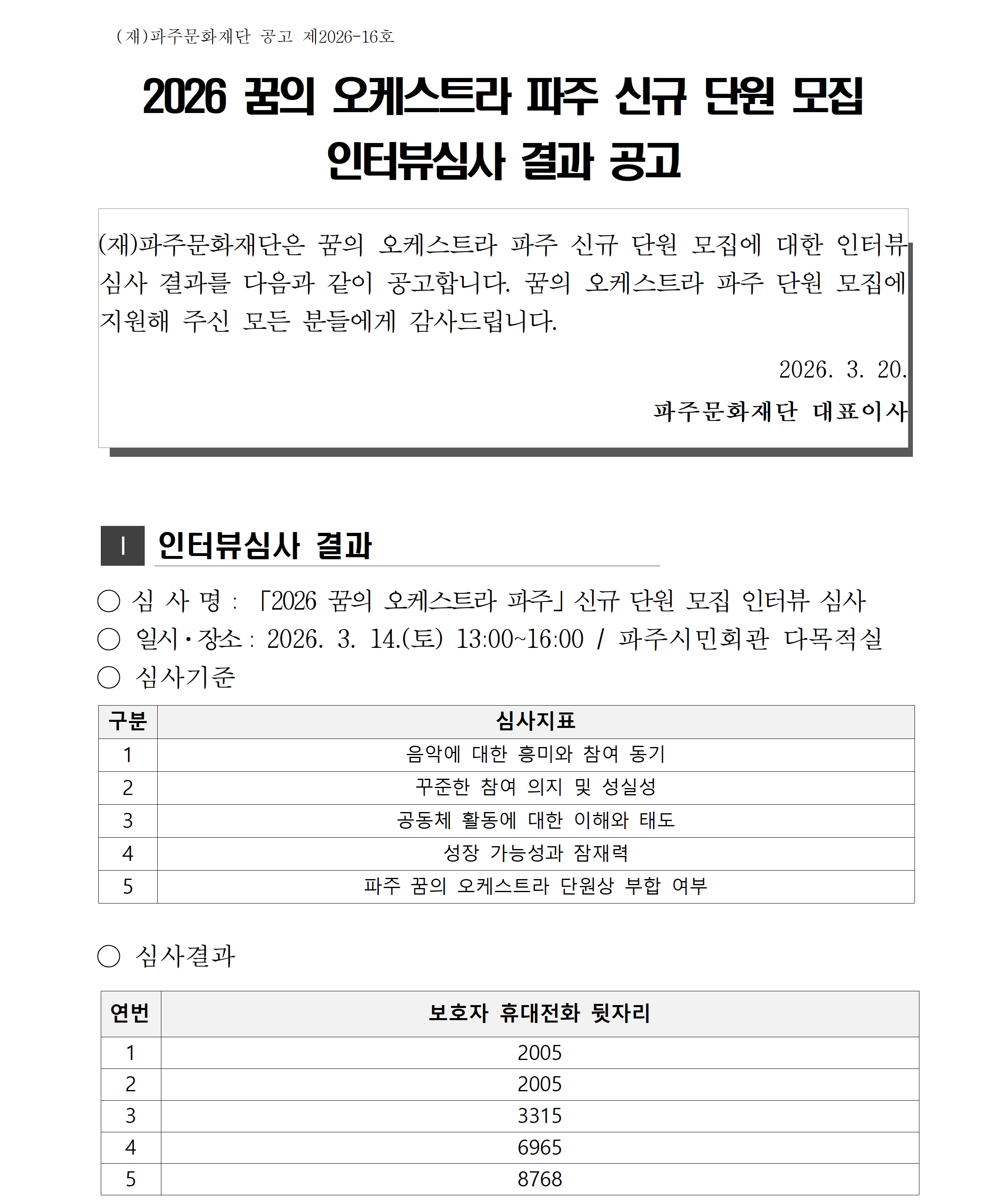 [파주문화재단 공고 제2026-16호] 2026 꿈의 오케스트라 파주 신규 단원 모집 인터뷰심사 결과 공고