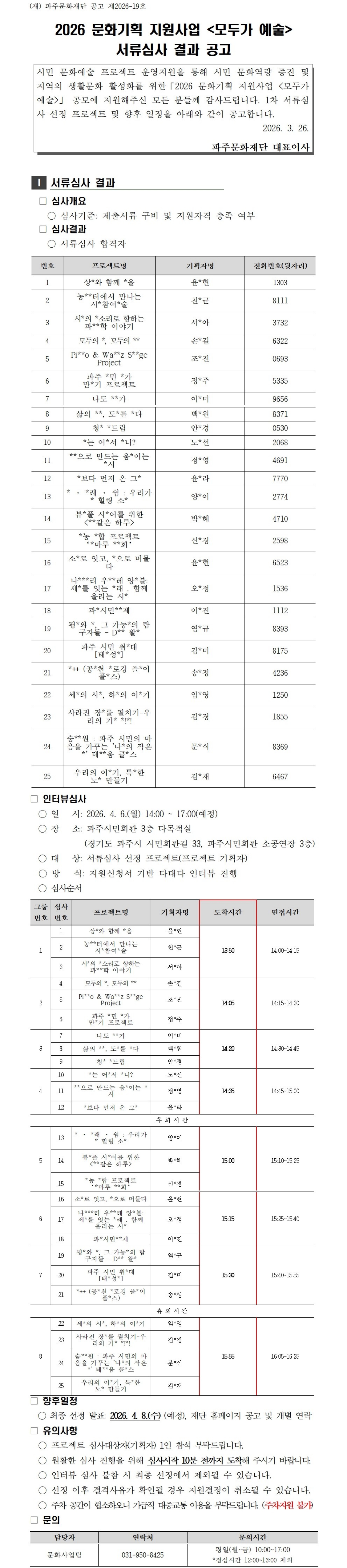 [파주문화재단 공고 제2026-19호] 2026 문화기획 지원사업 <모두가 예술> 서류심사 결과 공고