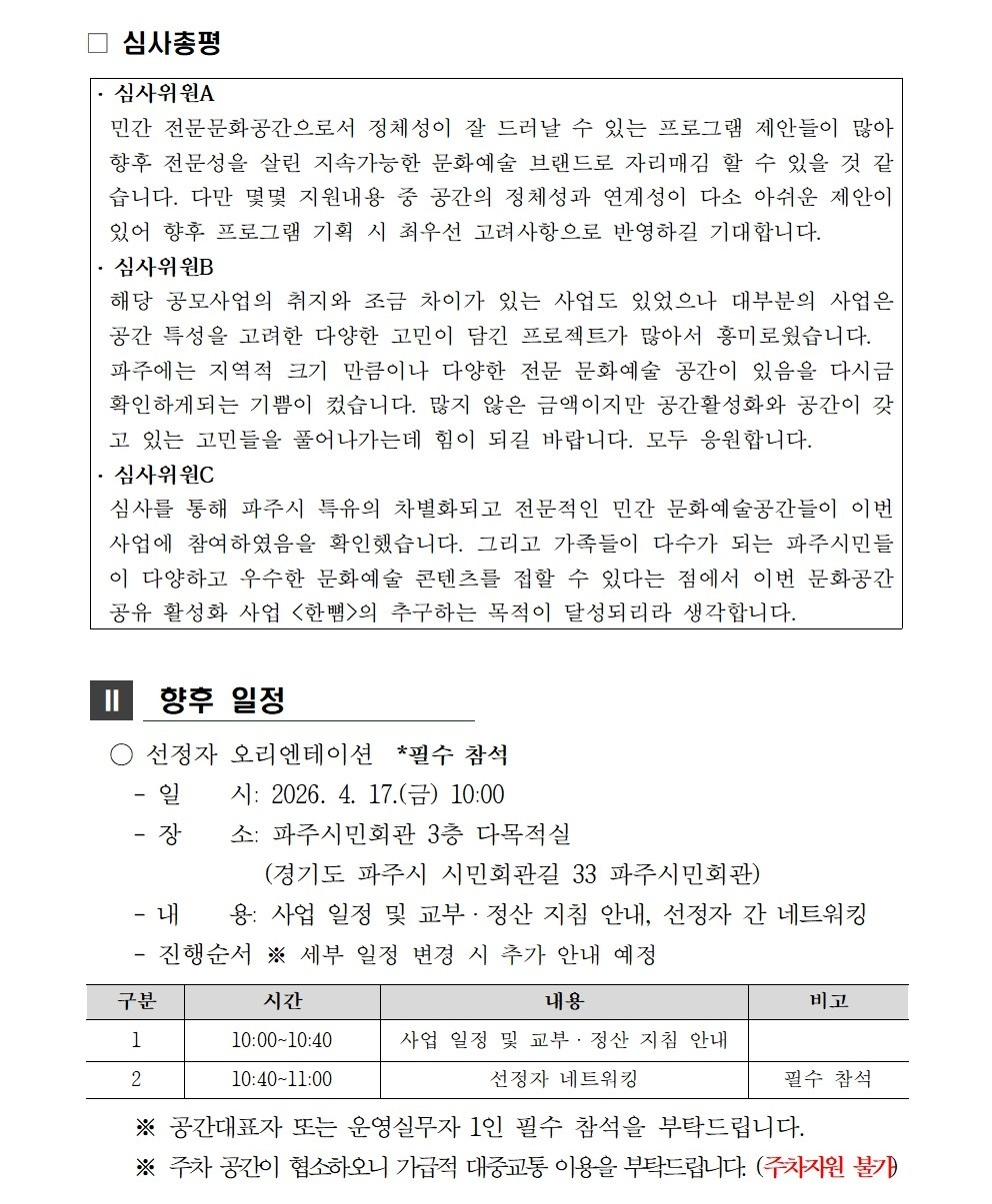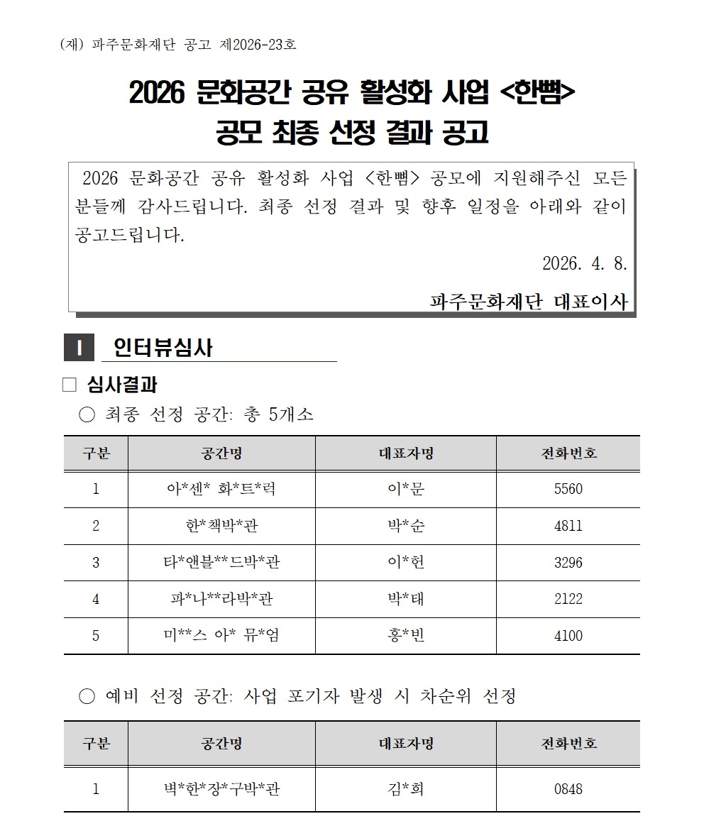 [파주문화재단 공고 제2026-23호] 2026 문화공간 공유 활성화 사업 <한뼘> 공모 최종 선정 결과 공고