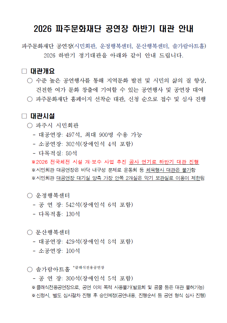 2026년 파주문화재단 공연장 하반기 정기대관 안내
