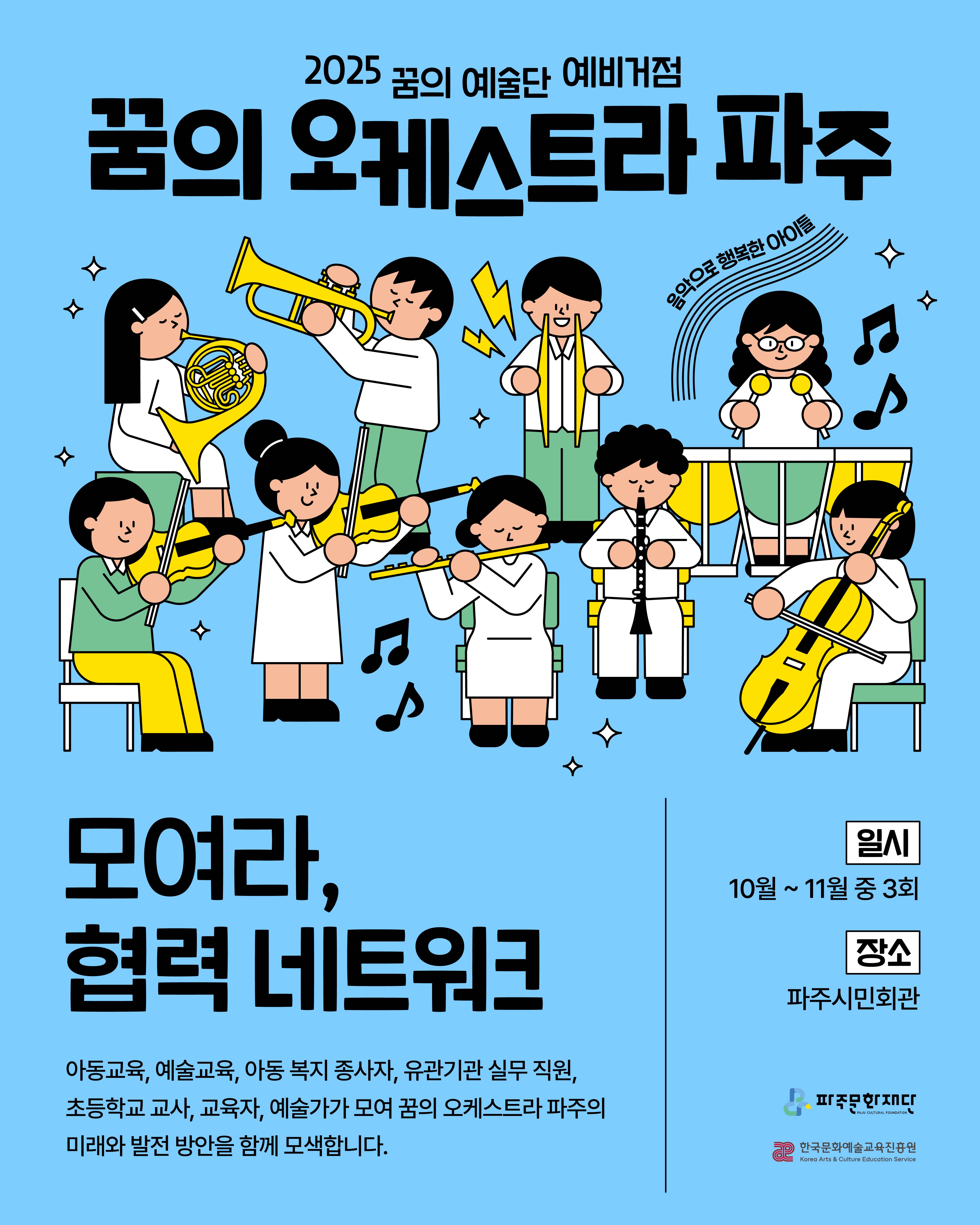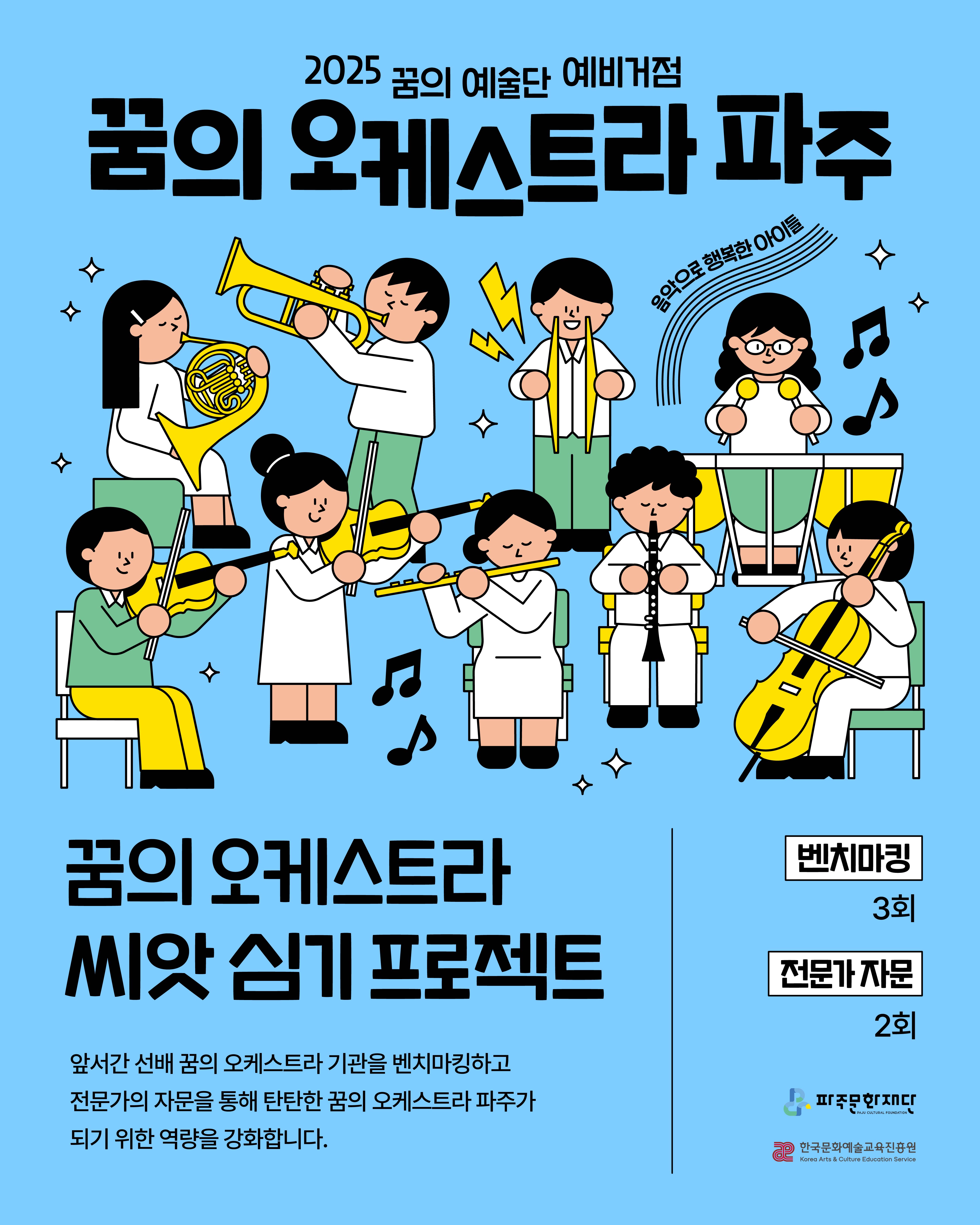 파주문화재단은 음악으로 행복한 파주 아이들을 위한 오케스트라를 만들기 위해 내적역량을 강화하고 외부 협력을 구축하고 참여기반을 조성하고 있습니다.