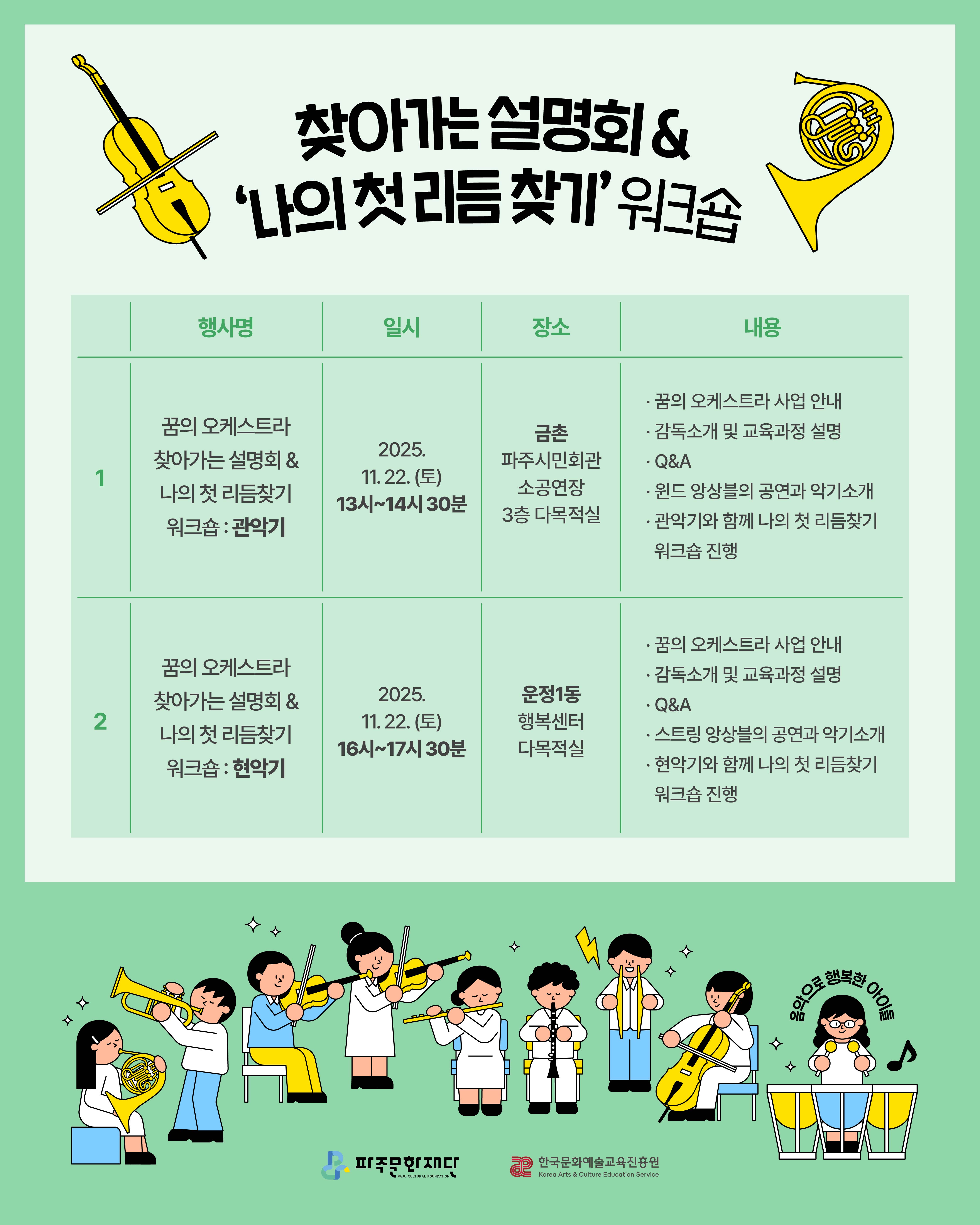11.22. 토요일 금촌과 운정서 개최하는 <찾아가는 설명회 & ‘나의 첫 리듬 찾기’ 워크숍>은 꿈의 오케스트라에 관심있는 아동, 학부모, 시민 누구나 참여할 수 있는 자리입니다. 꿈의 오케스트라 사업의 취지와 운영 방향을 공유하고 음악가와 함께 접해보기 힘든 다양한 클래식 악기들을 체험해보는 워크숍도 함께 진행합니다.