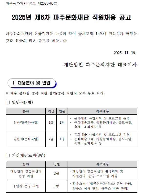 [파주문화재단 공고 제2025-60호] 2025년 제6차 파주문화재단 직원채용 공고