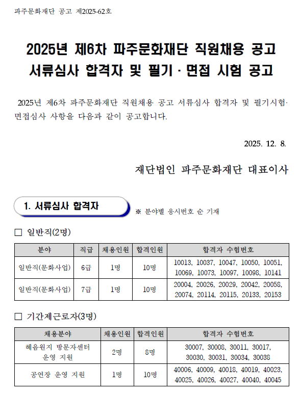 [파주문화재단 공고 제2025-62호] 2025년 제6차 파주문화재단 직원채용 서류심사 합격자 및 필기·면접 시험 공고문