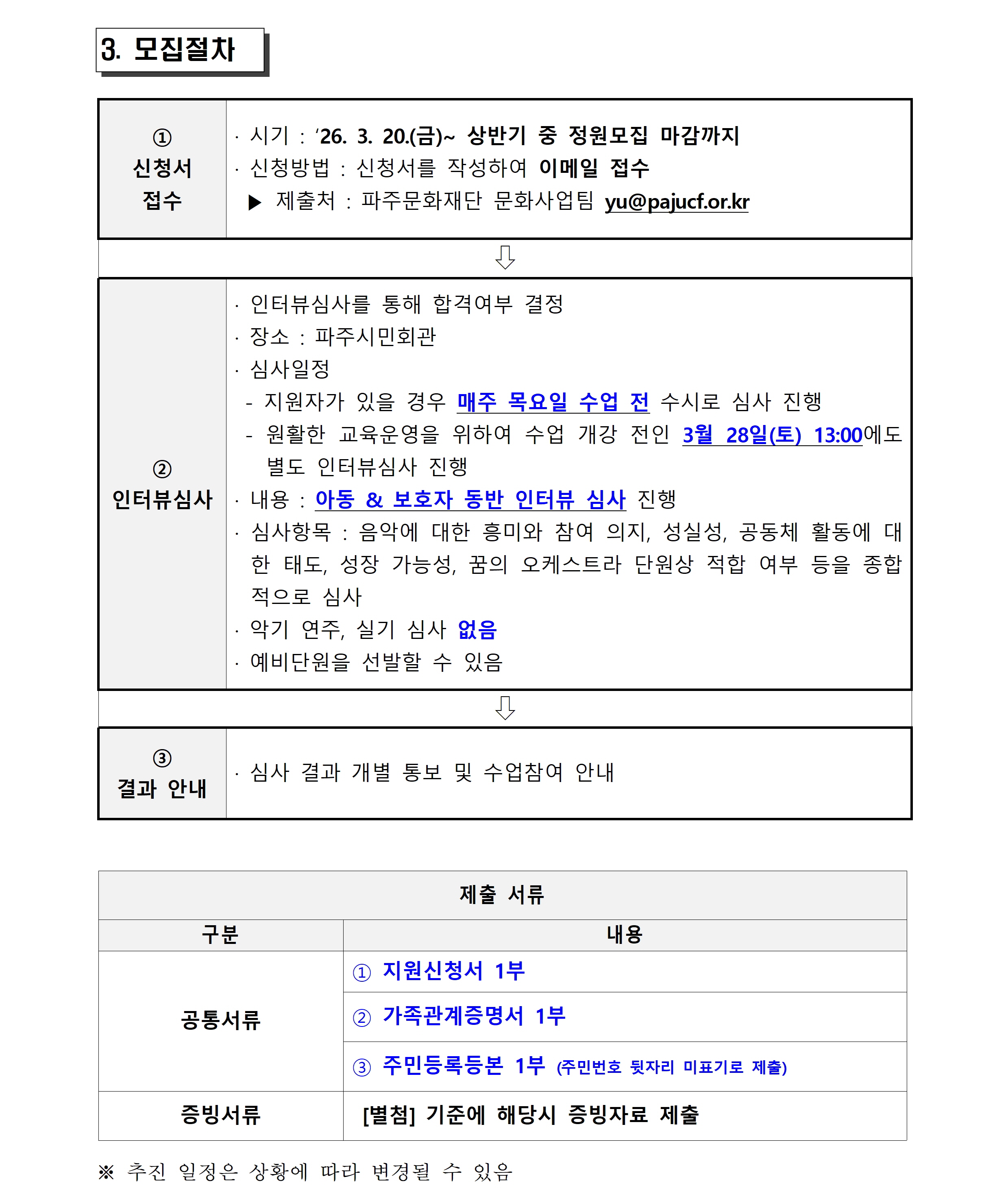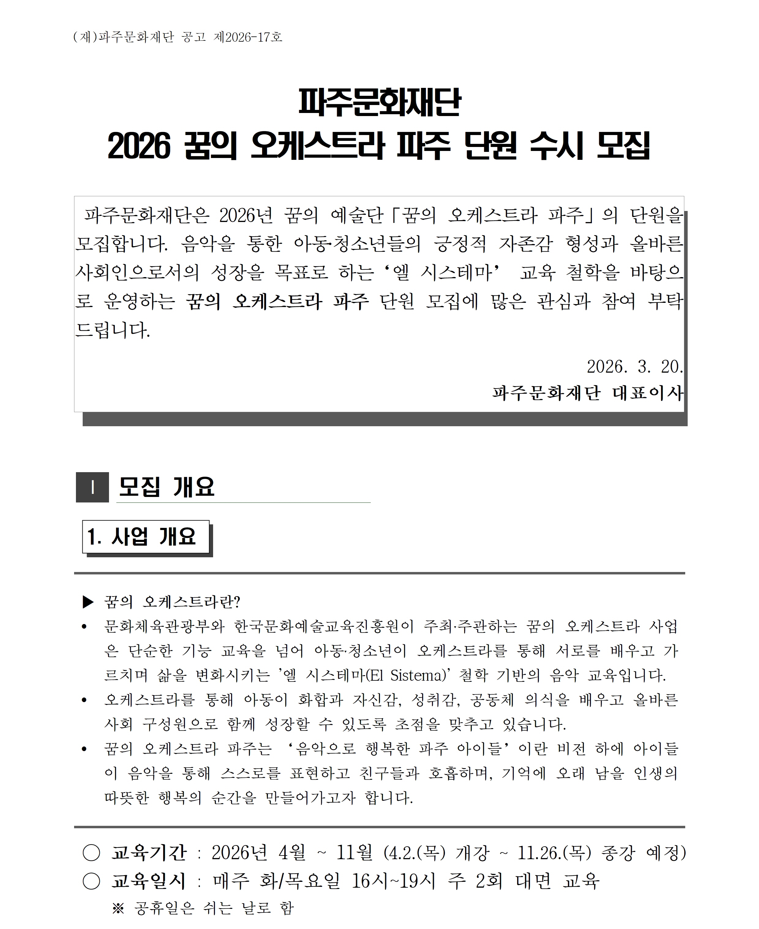 [파주문화재단 공고 제2026-17호] 2026 꿈의 오케스트라 파주 단원 수시모집 공고